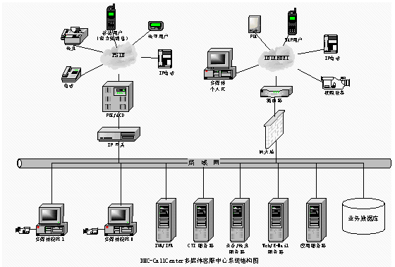 普通電話用戶通過PSTN接入DHC- UIPS綜合信息平臺系統(tǒng),接受話務員服務或自動業(yè)務流程。傳真用戶進入系統(tǒng)可以進行傳真業(yè)務。計算機用戶也可以通過Internet訪問企業(yè)客戶服務系統(tǒng)主頁,獲得服務。同時計算機用戶也可以通過Internet利用網絡電話的功能要求話務員服務或自動業(yè)務流程。