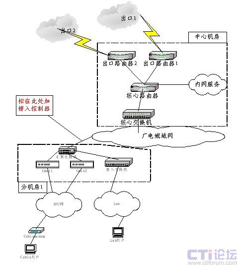 南通廣電目前的IP網(wǎng)絡(luò)拓?fù)淙缦聢D所示,現(xiàn)有電視塔總前端機(jī)房1個(gè);分機(jī)房共有4個(gè),每個(gè)分機(jī)房的情況相同。個(gè)人用戶(hù)以cable modem用戶(hù)為主,用戶(hù)通過(guò)HFC網(wǎng)絡(luò)接入頭端(cmts),再經(jīng)匯聚交換機(jī)接入廣電城域網(wǎng)后經(jīng)電視塔總前端機(jī)房訪(fǎng)問(wèn)internet,新的頭端系統(tǒng)采用Cisco 公司的ubr10012和ubr7246,目前暫決定cable modem和用戶(hù)的PC設(shè)備均通過(guò)DHCP服務(wù)器(Cisco 的CNR軟件)獲得IP地址;Lan用戶(hù)除接入方式不同外,IP地址采用靜態(tài)分配的辦法。目前廣電為部分個(gè)人用戶(hù)分配公網(wǎng)IP地址,其他個(gè)人用戶(hù)分配私網(wǎng)地址由出口防火墻通過(guò)NAT完成地址轉(zhuǎn)換。