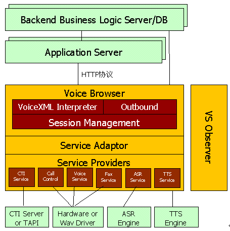 用于存放和產(chǎn)生VoiceXML腳本,可以是文件系統(tǒng)或WEB服務(wù)器,一般文件系統(tǒng)應(yīng)用于靜態(tài)腳本,WEB服務(wù)器應(yīng)用于動態(tài)腳本;應(yīng)用邏輯組件或中間件,進(jìn)行事務(wù)處理。