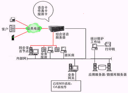 本系統(tǒng)物理結構由帶語音板卡的高性能工控機(稱為綜合語音服務器,在功能上可以分為CTI服務器、IVR(交互式語音應答)/IFR服務器、統(tǒng)計維護管理工作站、數(shù)據(jù)庫/應用服務器、錄音留言工作站、業(yè)務網關服務器、業(yè)務代表座席、網絡系統(tǒng)等和應用軟件構成。