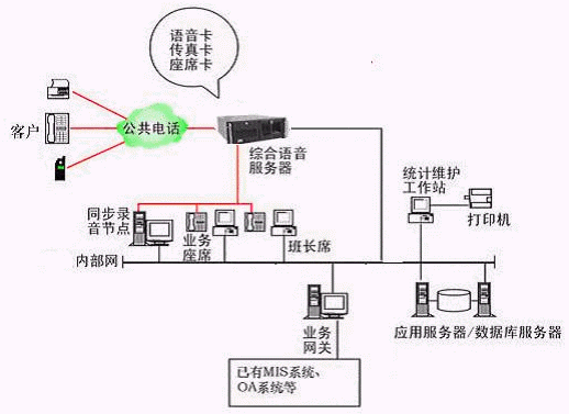 本系統(tǒng)物理結(jié)構(gòu)由帶語(yǔ)音板卡的高性能工控機(jī)(稱為綜合語(yǔ)音服務(wù)器,在功能上可以分為CTI服務(wù)器、IVR(交互式語(yǔ)音應(yīng)答)/IFR服務(wù)器、統(tǒng)計(jì)維護(hù)管理工作站、數(shù)據(jù)庫(kù)/應(yīng)用服務(wù)器、錄音留言工作站、業(yè)務(wù)網(wǎng)關(guān)服務(wù)器、業(yè)務(wù)代表座席、網(wǎng)絡(luò)系統(tǒng)等和應(yīng)用軟件構(gòu)成。