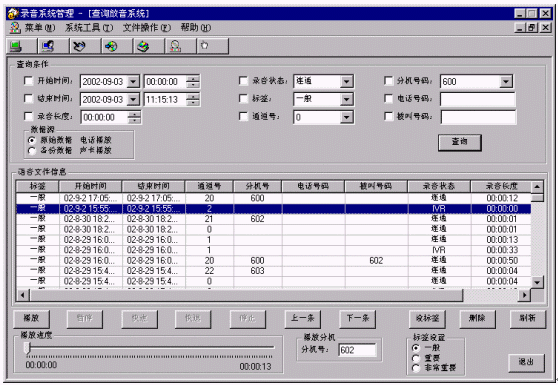 對查詢出來的聲音文件,可以選定一個或多個通過電話或聲卡播放。