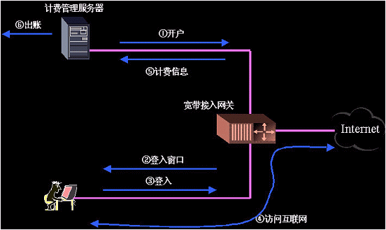 當(dāng)用戶(hù)選擇上網(wǎng)后。管理人員首先通過(guò)計(jì)費(fèi)管理服務(wù)器為用戶(hù)開(kāi)戶(hù)。出用戶(hù)在打開(kāi)瀏覽器試圖訪問(wèn)Internet時(shí)會(huì)彈來(lái)自接入網(wǎng)關(guān)要求登入的窗口。用戶(hù)輸入用戶(hù)名、密碼并可以選擇適合自己的資費(fèi)方式。輸入信息后接入網(wǎng)關(guān)將信息交由計(jì)費(fèi)管理服務(wù)器處理。計(jì)費(fèi)管理服務(wù)器驗(yàn)證通過(guò)后,向該用戶(hù)開(kāi)放互聯(lián)網(wǎng)出口。在用戶(hù)訪問(wèn)互聯(lián)網(wǎng)的同時(shí),接入網(wǎng)關(guān)計(jì)錄下該用戶(hù)訪問(wèn)互聯(lián)網(wǎng)的相關(guān)信息,其中包括訪問(wèn)的時(shí)長(zhǎng)和數(shù)據(jù)流量。接入網(wǎng)關(guān)實(shí)時(shí)地向計(jì)費(fèi)管理服務(wù)器更新用戶(hù)的計(jì)費(fèi)信息,用戶(hù)斷網(wǎng)后計(jì)費(fèi)管理服務(wù)器計(jì)算用戶(hù)上網(wǎng)費(fèi)用。