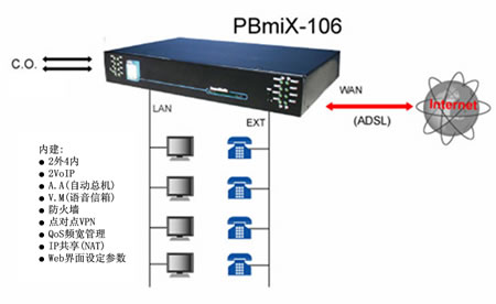 在21世紀的今日,隨著網(wǎng)絡(luò)應(yīng)用的普及,無論是個人或企業(yè)對于交換機的觀念若仍拘泥于傳統(tǒng)的思維,將是落伍的。免費網(wǎng)絡(luò)電話、分散式系統(tǒng),將是傳統(tǒng)交換機 在增加語音信箱/自動總機功能之后,系統(tǒng)機制的重大變革。本公司推出的PBmaX/PBmiX系列IP-PBX,不但將上述所有功能整合于一體,進一步可內(nèi)建公司VPN、Web服務(wù)器、GateKeeper等功能,呈現(xiàn)出數(shù)字交換機的全新風(fēng)貌,并將新的電話使用觀念帶進企業(yè)、SOHO辦公室與家庭內(nèi)。