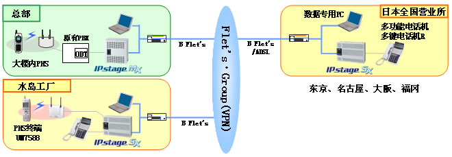 SX”通過SIP協(xié)作的IP電話系統(tǒng)。系統(tǒng)中所采用的“IPstage MX/SX”通過NTT西日本的VPN服務“Flet's・Group”相互連接,實現(xiàn)高音質的內線環(huán)境。使用內線電話號碼進行事業(yè)所之間的通話聯(lián)系,可以直接與想聯(lián)系的對象通話,無需傳叫電話。進而,由于工廠采用了沖電氣所制造的PHS終端“UM7588”,可以在工廠任何地方實現(xiàn)直接電話聯(lián)系。導入該系統(tǒng)后,即使業(yè)務場所分處幾地,也能成功實現(xiàn)員工間的迅速溝通。