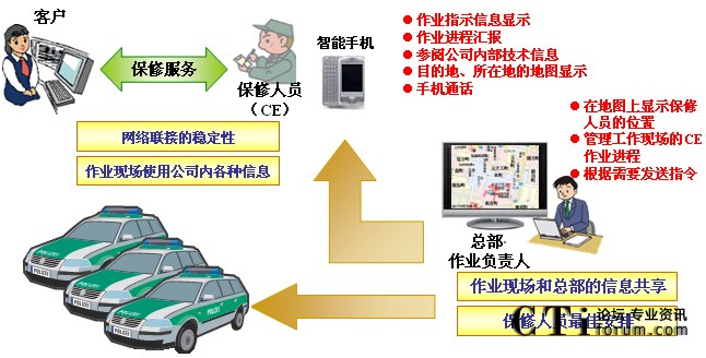 “MoBiz AP for CE支持系統(tǒng)”在加強(qiáng)總部和現(xiàn)場維修人員的聯(lián)動基礎(chǔ)上,通過準(zhǔn)確把握地點(diǎn)信息和作業(yè)進(jìn)展?fàn)顩r,有效安排工作人員,從而達(dá)到提高工作人員一天的工作現(xiàn)場訪問次數(shù)。進(jìn)一步說,有助于客戶SLA(注3)的遵守和客戶滿意度(CS)的提高。