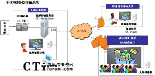 CTI論壇(ctiforum)2月22日消息(記者 張塵):近日沖電氣工業(yè)株式會(huì)社(OKI)子公司沖網(wǎng)絡(luò)株式會(huì)社和日本九州大學(xué)(校長(zhǎng):有川節(jié)夫,地址:日本福岡縣福岡市)一起成功完成向國(guó)外轉(zhuǎn)播HD(注1)手術(shù)視頻的測(cè)試。此項(xiàng)測(cè)試是2月8日至10日在澳大利亞悉尼召開(kāi)的“第29屆Asia-Pacific