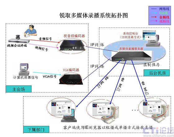 如上圖所示,硬件系統(tǒng)采用了前后臺(tái)分離的模式,前端的視音頻編碼器將從終端上采集的視音頻信號(hào)與VGA編碼器采集的VGA信號(hào)進(jìn)行編碼,通過(guò)內(nèi)部專屬網(wǎng)絡(luò)傳輸?shù)胶笈_(tái)機(jī)房的錄播服務(wù)器中,通過(guò)服務(wù)器內(nèi)部功能模塊,不僅將整個(gè)會(huì)議或者培訓(xùn)現(xiàn)場(chǎng)的視音頻與電腦桌面內(nèi)容同步錄制保存在專屬硬盤(pán)中,同時(shí)將上述采集內(nèi)容實(shí)時(shí)轉(zhuǎn)發(fā)直播到用戶局域網(wǎng)中。通過(guò)錄播系統(tǒng)的身份驗(yàn)證機(jī)制,通過(guò)連接到網(wǎng)絡(luò)中的任意一臺(tái)PC即可接收直播的內(nèi)容。同時(shí)錄制保存在專屬硬盤(pán)上的內(nèi)容還可以后期點(diǎn)播回訪(需身份驗(yàn)證)。