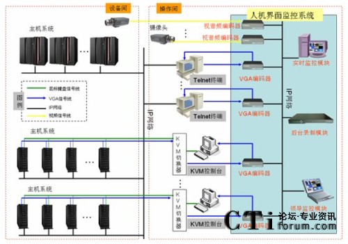 如上圖所示,該機房分為設備間和操作間,小型機等主機系統(tǒng)安裝在設備間內,平時工作人員通常在操作間內通過Telnet終端及KVM控制臺等方式訪問主機系統(tǒng)進行操作,這些Telnet終端、KVM控制臺即為機房內人與機器打交道的“人機界面”。