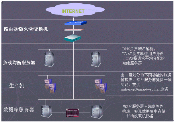 從軟件系統(tǒng)要求的分布式結(jié)構(gòu),并考慮到前期50萬(wàn)郵箱的規(guī)模,為了兼顧性能和造價(jià),建議采用高端IA架構(gòu)服務(wù)器作為硬件平臺(tái),另一方面充分考慮系統(tǒng)軟件的高可用性結(jié)構(gòu)設(shè)計(jì)。
