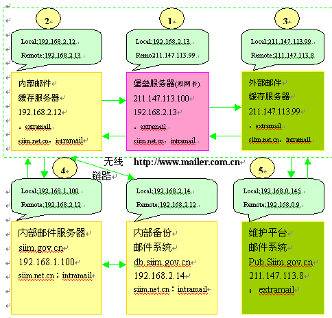 iii. 接收外部郵件時,先由郵件網關統(tǒng)一收取,然后再根據各地的二級域名不同進行內部二次投遞。