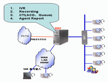 Asterisk IP PBX與相關板卡結合就能夠?qū)崿F(xiàn)IP PBX與呼叫中心完美結合的一體化解決方案。該方案結合了IP網(wǎng)的靈活性及硬件平臺自身強大的通信能力、板載資源、媒體處理能力和多種接口等而產(chǎn)生的一種高效、便捷、低成本的應用方案。與傳統(tǒng)PBX及IP