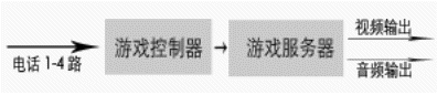 由于許多地區(qū),尤其是縣級市沒有信息平臺,而且許多電視臺愿與電話局直接合作。在這種情況下,電話局和電視臺合作對有線用戶公布 特服號碼,如123456,參與互動游戲的用戶,統(tǒng)一撥打該號碼,電話局提供四條用戶線給互動游戲系統(tǒng),同時對撥打123456的用戶都轉(zhuǎn)到這四條用戶線來,從而接入到互動游戲系統(tǒng),由系統(tǒng)給出語音提示引導(dǎo)用戶參與比賽。由于系統(tǒng)最多允許四個人參與比賽,當用戶滿時,撥打游戲熱線的用戶