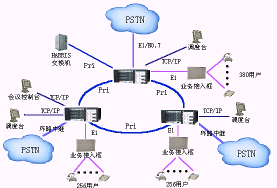 該方案適用于用戶需要建立自己的通信網并能實現行政交換、電話會議、調度交換、語音信箱等多種功能。這種方案解決的業(yè)務種類多,能滿足用戶的多種需要。