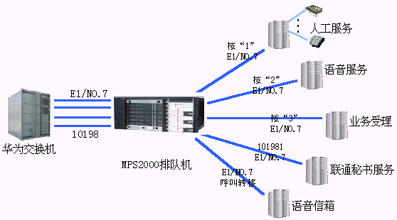 我司的排隊機通過E1與華為交換機相連,采用No.7信令。華為交換機將需要播放語音的中繼直接轉接到排隊機上,由排隊機相應的中繼板和語音導航板提供語音通道和DTMF收號,根據用戶的按鍵選擇轉接到相應的語音平臺上去。這樣的系統(tǒng)很好的解決了四川聯(lián)通的需求。