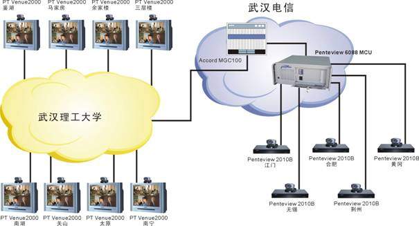 武漢理工大學(xué)的遠(yuǎn)程教學(xué)系統(tǒng)由于分3期建設(shè),網(wǎng)絡(luò)條件較為復(fù)雜。一期主要以PT的Venue2000終端+Accord MGC100 MCU為主,是一個(gè)H323系統(tǒng);二、三期采用中太多媒體的Penteview2010終端+Penteview6088MCU,是一個(gè)H320系統(tǒng),兩套系統(tǒng)通過(guò)網(wǎng)關(guān)無(wú)縫結(jié)合到一起工作,用戶根本感覺(jué)不到不同。各教室均同時(shí)采用了中太多媒體的遠(yuǎn)程教學(xué)支撐系統(tǒng),通過(guò)對(duì)Penteview會(huì)議電視系統(tǒng)的擴(kuò)充,實(shí)現(xiàn)了以下功能,使教學(xué)應(yīng)用更加方便: