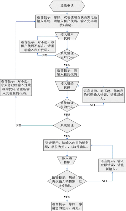 2) 系統(tǒng)每天從早上9:00--11:30為輸入工作時(shí)間,租戶在其它時(shí)間進(jìn)入本系統(tǒng)時(shí),系統(tǒng)自動(dòng)播放"輸入銷售數(shù)據(jù)時(shí)間已過,請(qǐng)您在每天早上9:00--11:30間登錄系統(tǒng),謝謝您的使用,再見!"系統(tǒng)每天只能錄入前一天的銷售數(shù)據(jù),并對(duì)此進(jìn)行提示。