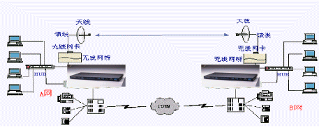 A網(wǎng)與B網(wǎng)分別為兩個局域網(wǎng),通過兩臺WavePoint II無線網(wǎng)橋?qū)蓚局域網(wǎng)連在一起,網(wǎng)橋上的RJ45口或BNC細纜接口與局域網(wǎng)相連。每臺網(wǎng)橋上插有一塊WaveLAN無線PC卡,PC卡的射頻輸出端口,通過饋線接到天線,通過PC卡來完成無線鏈路的連通。無線網(wǎng)橋連接完成后的效果類似HUB級連。IP語音網(wǎng)關-HGW-904的局域網(wǎng)接口(RJ45)連接到局域網(wǎng)的HUB上,根據(jù)用戶實際的話務量,選用Line端口接入用戶電話交換機(PBX),PBX接普通電話機和傳真機,并連接至電話公網(wǎng)(PSTN)。其中所需設備:HGW-904