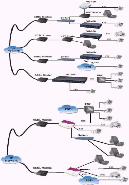 總部采用可堆疊的VG-2000,通過IP網(wǎng)絡(互聯(lián)網(wǎng))同各中心或分支機構的相連,利用PBX(小型電話交換總機)的交換能力將話音自動轉(zhuǎn)到VG-2000上,通過數(shù)據(jù)專線、VPN或Internet傳輸?梢栽赩G-2000上進行流量控制(Bandwidth