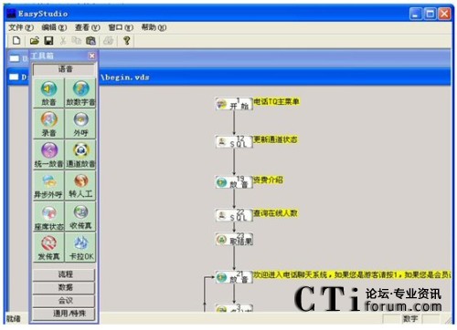 兩個(gè)集成環(huán)境,Easy Studio負(fù)責(zé)自動(dòng)語音流程的編輯和調(diào)試,EasyAdmin負(fù)責(zé)對語音卡硬件的操作和按照EasyStudio生成的具體語音流程的實(shí)現(xiàn)。EasyCTI綜合實(shí)現(xiàn)了呼叫中心中IVR(Interactive