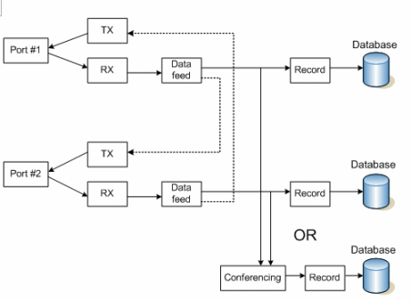 上圖中的媒體和控制數(shù)據(jù)流表示通過(guò)Prosody S (HMP) 或Prosody X板卡建立的兩個(gè)(或多個(gè))端點(diǎn)之間的呼叫。媒體流(RTP)和信令信息都通過(guò)監(jiān)控平臺(tái)本身傳輸,高級(jí)的應(yīng)用系統(tǒng)會(huì)記錄所有SIP/H.323事件和消息。傳真信息也可以存儲(chǔ),保存在TiFF格式的圖形文件內(nèi)。這里,系統(tǒng)可以在兩端分別錄制RTP流,也可以采用會(huì)議的方式錄制在一起。