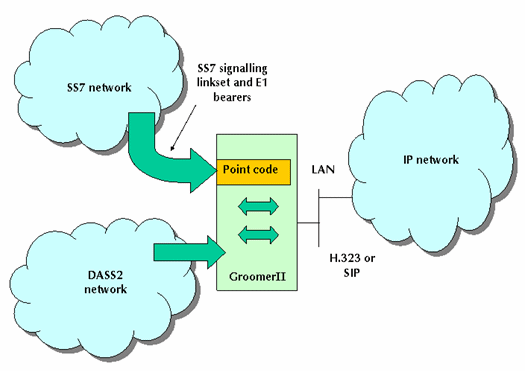 如上所述,GrommerII可以安裝不同的協(xié)議軟件。圖2中的系統(tǒng)配備了SS7和DASS2的GrommerII,擔當與IP網(wǎng)絡(luò)相連的網(wǎng)關(guān),完成IP呼叫。