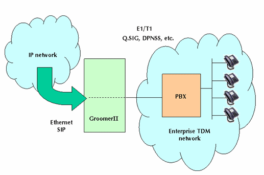 圖1中的GroomerII支持PRI協(xié)議,如:NI-2、ETS300和INS1500等,可以實現(xiàn)網(wǎng)關(guān)的功能把運營商自己的電路交換網(wǎng)和IP網(wǎng)絡(luò)相互連接在一起。這種設(shè)置允許網(wǎng)絡(luò)運營商向其他業(yè)務供應商提供批量VoIP業(yè)務。這類業(yè)務運營商據(jù)此可以向他們的客戶提供具有區(qū)分性的業(yè)務,如:利用SIP電話呼叫等。