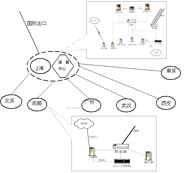 數(shù)據(jù)網(wǎng)絡(luò)為DDN專線構(gòu)成的Intranet,該Intranet在國內(nèi)可以有一個以上的國際出口。并通過防火墻同Internet連接。語音/數(shù)據(jù)的傳輸采用網(wǎng)絡(luò)交換設(shè)備。