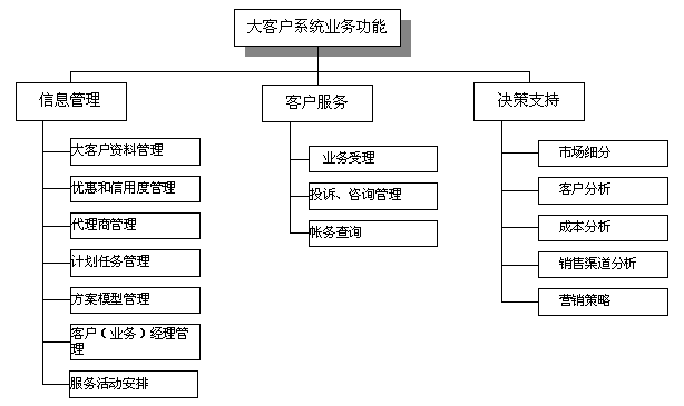 電信大客戶管理系統(tǒng)是在收集大客戶市場調(diào)查信息、大客戶資料信息、大客戶經(jīng)營戰(zhàn)略資源的基礎(chǔ)上,自動采集專業(yè)計費、綜合營帳、客服、網(wǎng)管、財務(wù)等系統(tǒng)的相關(guān)數(shù)據(jù),實現(xiàn)快速、全面、準(zhǔn)確的新客戶業(yè)務(wù)受理、新增需求受理及故障處理過程通道,實現(xiàn)完善的客戶經(jīng)理管理、代理商管理系統(tǒng),最終實現(xiàn)完整的大客戶滿意度評估體系和針對大客戶的個性化服務(wù)。建成后的系統(tǒng)從管理、服務(wù)、分析三方面出發(fā)主要應(yīng)具備信息管理、客戶服務(wù)、決策支持功能。