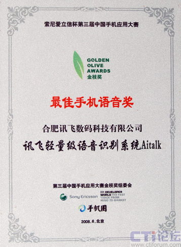 2008年6月26日,代表了中國(guó)手機(jī)應(yīng)用最高水平、最新發(fā)展的索尼愛立信杯第三屆中國(guó)手機(jī)應(yīng)用大賽金枝獎(jiǎng)?lì)C獎(jiǎng)典禮在北京隆重舉行,科大訊飛全資子公司——訊飛數(shù)碼提交的參賽產(chǎn)品,輕量級(jí)語(yǔ)音識(shí)別系統(tǒng)Aitalk,榮獲本屆大賽 “最佳手機(jī)語(yǔ)音金枝獎(jiǎng)”。這是科大訊飛既在本賽事首屆、第二屆獲此殊榮后,連續(xù)第三年奪得該獎(jiǎng)項(xiàng),充分體現(xiàn)了科大訊飛在手機(jī)語(yǔ)音應(yīng)用領(lǐng)域具備的超群實(shí)力和絕對(duì)的領(lǐng)先地位。