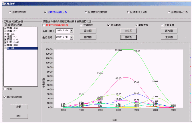 從圖1分析,98-2004年該領(lǐng)域技術(shù)發(fā)展大致分為3個(gè)周期,即98-2000年、2001-2003年、2003-2004年。目前正處于第三個(gè)周期后期。