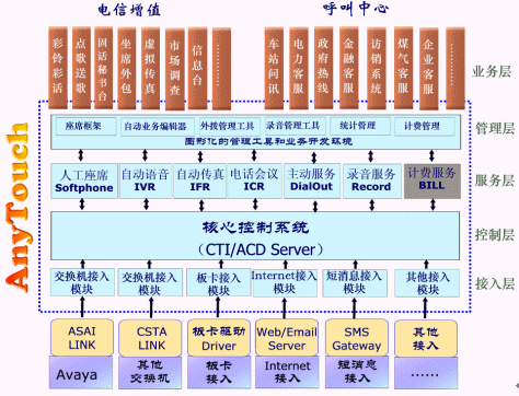 佳訊飛鴻近十年來一直致力于建設(shè)國內(nèi)一流的呼叫中心系統(tǒng)和電信增值業(yè)務(wù),其CTI方面的主打產(chǎn)品AnyTouch平臺(tái)廣泛應(yīng)用到電信、鐵路、軍隊(duì)、郵政、媒體、政府、電力、金融和商業(yè)等多個(gè)行業(yè)的呼叫中心、客服中心、CRM、電子商務(wù)和信息化平臺(tái)項(xiàng)目建設(shè)中。AnyTouch平臺(tái)是融合呼叫中心和電信增值業(yè)務(wù)的CTI應(yīng)用產(chǎn)品,是一個(gè)綜合的、集成的開發(fā)工具。她能夠構(gòu)建各種熱線電話系統(tǒng)、客戶服務(wù)系統(tǒng)、企業(yè)服務(wù)中心等呼叫中心業(yè)務(wù);同時(shí)可生成彩話、點(diǎn)歌、固話秘書臺(tái)、信息臺(tái)等電信增值業(yè)務(wù)。