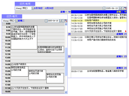 上圖"日歷管理"就借鑒了圖形化交互方法來安排日程和任務(wù)。這與您曾經(jīng)用過的桌面臺歷或記事本一樣,無需介紹就一目了然,并且要比在紙張上勾勾寫寫更方便、更有好處。例如,您此前計(jì)劃過日程,實(shí)際執(zhí)行有些變化,之后托托拽拽那個(gè)日程就可修改開始時(shí)間、持續(xù)時(shí)間,或修改主題內(nèi)容,有效提高了記錄工作日程的效率;又例如,可以根據(jù)需要設(shè)定"提醒"--即便對過期的、未及時(shí)處理的工作安排隨后也會(huì)提示,有了這樣的人性化服務(wù)助手,員工自然歡喜。