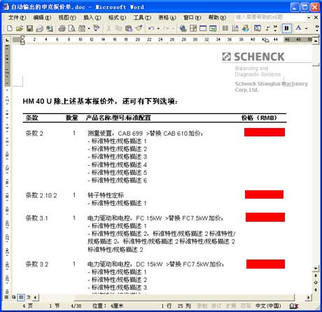 以上海申克的報(bào)價(jià)單為例。與其說(shuō)它是一份報(bào)價(jià)單,不如說(shuō)它是一套幾十頁(yè)的客戶化復(fù)雜方案書,它由各方面數(shù)據(jù)和文檔自動(dòng)合并、輸出為一份Word文件: