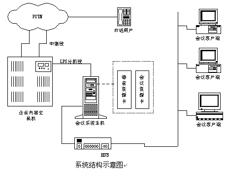 說明:如果沒有企業(yè)內(nèi)部程控交換機(jī)則可以將中繼線直接接在會(huì)議系統(tǒng)主機(jī)上,中繼線可以是普通模擬中繼,也可以是E1接口(如中國(guó)一號(hào)信令、30B+D等)。在與會(huì)議系統(tǒng)主機(jī)的同一網(wǎng)段上可以配置多個(gè)會(huì)議客戶端系統(tǒng),通過客戶端系統(tǒng)用戶可以隨時(shí)觀察和監(jiān)視會(huì)議系統(tǒng)的使用情況,并且可以建立常用用戶的用戶資料,也可以對(duì)常用用戶進(jìn)行分組,這樣要呼叫某些用戶開會(huì)時(shí)只需呼叫組用戶即可;