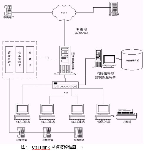 正是基于以上考慮,北京強訊公司根據(jù)多年來在企業(yè)級辦公自動化通信領(lǐng)域積累的經(jīng)驗,推出了"CallThink 企業(yè)級呼叫中心系統(tǒng)",該系統(tǒng)充分考察大多數(shù)企業(yè)的實際情況,本著合理利用現(xiàn)有設(shè)備,以最小的投入獲取最大的效益的原則,包含了自動呼叫分配(ACD)、交互式語音應(yīng)答(IVR)、計算機語音集成(CTI)、客戶關(guān)系管理(CRM)等業(yè)務(wù)。