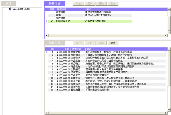 一套好的CRM軟件,應(yīng)當(dāng)同時(shí)支持多種銷售方法。例如,精密機(jī)械制造行業(yè),有可能同時(shí)需要支持四種銷售方法:標(biāo)準(zhǔn)整機(jī)銷售方法、項(xiàng)目型整機(jī)銷售方法、零件及有償服務(wù)銷售方法、三包件等。每個(gè)銷售方法都有對(duì)應(yīng)的銷售流程。以圖2為例,我們看到"機(jī)械設(shè)備直銷"的銷售方法,對(duì)應(yīng)著15個(gè)銷售階段,每個(gè)階段都可通過簡(jiǎn)述來明確該階段典型的業(yè)務(wù)特征、成交可能性的區(qū)間,以便銷售代表在操作記錄的時(shí)候擁有共識(shí)。