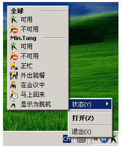 用戶可以點擊“設(shè)置狀態(tài)”工具欄的上圖標(biāo)或是點擊右下角“系統(tǒng)托盤”中的圖標(biāo)來設(shè)置自己的工作狀態(tài)。