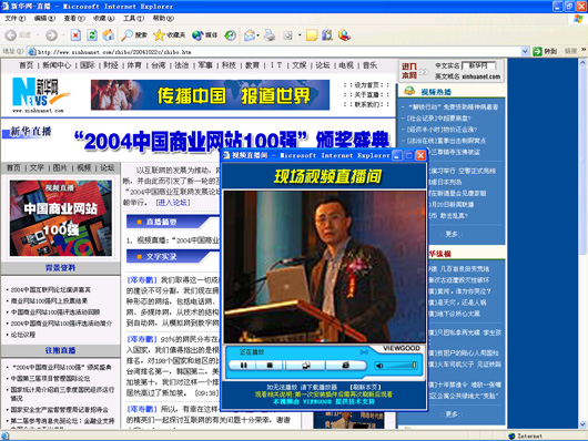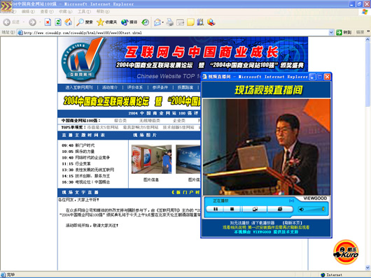 作為此次活動全程流媒體直播技術(shù)提供商VIEWGOOD(www.viewgood.com)商務主管在活動現(xiàn)場說:“中國大陸的上網(wǎng)用戶總?cè)藬?shù)即將突破1億,中外商業(yè)網(wǎng)站的資本運作空前活躍,3G、IPv6等新技術(shù)將催生互聯(lián)網(wǎng)的新一輪變革,網(wǎng)絡媒體正在從“第四媒體”快速走向“第一媒體”,致力為中國互聯(lián)網(wǎng)媒體服務的VIEWGOOD和所有的網(wǎng)站一樣,既面臨著激烈的挑戰(zhàn),更面臨著難得的發(fā)展機遇。無論是成長最快的網(wǎng)站、最具潛力的網(wǎng)站,還是創(chuàng)新最佳的網(wǎng)站,都是VIEWGOOD的合作伙伴。我們將以國際最先進的流媒體技術(shù)服務于中國互聯(lián)網(wǎng)!