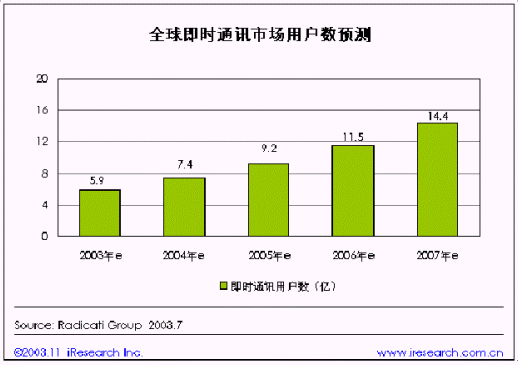 年即時通訊將成為互聯(lián)網(wǎng)上最普及的交流方式。隨著即時通訊的普及,全球即時通訊用戶規(guī)模也在不斷擴大。即時通訊市場龐大的用戶規(guī)模和增長潛力早已引起了業(yè)內(nèi)巨頭的激烈競爭。以美國為例,目前,AOL、MSN