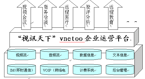 VNETOO視訊運(yùn)營(yíng)平臺(tái)具有強(qiáng)大的數(shù)據(jù)功能和優(yōu)質(zhì)的音視頻效果,是集"視頻+語(yǔ)音+數(shù)據(jù)+IM(即時(shí)通信)+VOIP(網(wǎng)絡(luò)電話)+計(jì)費(fèi)+后臺(tái)管理"的基于IP網(wǎng)絡(luò)世界一流視訊服務(wù)提供平臺(tái),它革命性地開(kāi)創(chuàng)了視訊運(yùn)營(yíng)領(lǐng)域的全新模式。(見(jiàn)圖表一:"視訊天下"vnetoo運(yùn)營(yíng)平臺(tái)結(jié)構(gòu))。