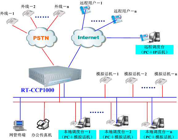 融天科技一體化IP調(diào)度指揮系統(tǒng)RT-CCP1000充分融入了先進(jìn)的VOIP技術(shù),支持遠(yuǎn)程IP用戶(hù)接入/遠(yuǎn)程調(diào)度模式,該調(diào)度系統(tǒng)可廣泛地適用于部隊(duì)、鐵路、水力、電力、航空、礦山、石油、冶金、化工等企業(yè)與單位,系統(tǒng)組網(wǎng)圖大致如下: