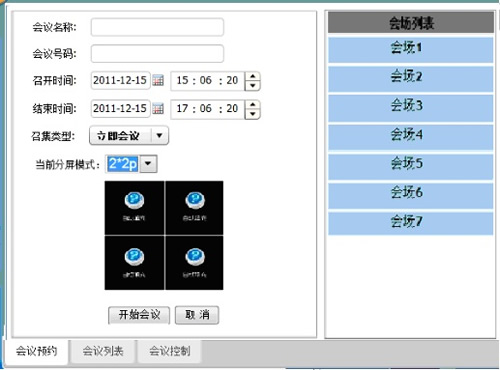 在調(diào)度臺(tái)界面主界面,點(diǎn)擊“視頻會(huì)議”按鈕,在終端區(qū)選擇會(huì)場(chǎng),再次點(diǎn)擊“視頻會(huì)議”按鈕,界面切換到會(huì)議設(shè)置界面,進(jìn)行相應(yīng)的設(shè)置,點(diǎn)擊“開(kāi)始會(huì)議”按鈕即可。