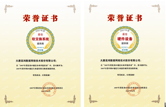 日前,由C114中國通信網(wǎng)主辦的“2007年度優(yōu)秀IP通信企業(yè)評選活動”圓滿結(jié)束。大唐高鴻數(shù)據(jù)網(wǎng)絡(luò)技術(shù)股份有限公司(以下簡稱“大唐高鴻”)憑借雄厚實力喜獲“2007年度中國IP通信行業(yè)最佳軟交換系統(tǒng)提供商”和“2007年度中國IP通信行業(yè)最佳硬件設(shè)備提供商”兩項大獎。這是大唐高鴻繼2007年4月榮獲中國VoIP論壇“2006年最佳中繼網(wǎng)關(guān)提供商”和“2006最佳VoIP解決方案提供商”兩項大獎之后的又一次實至名歸。