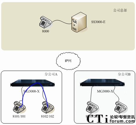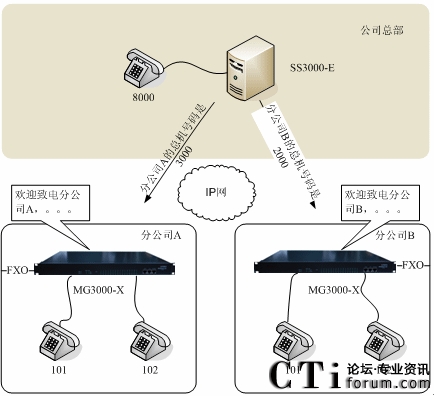 3. 總部給各分公司只分配一個(gè)號(hào)碼,做為分公司的總機(jī)接入號(hào)碼,例如給分公司A分配的號(hào)碼3000。