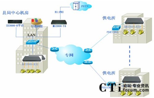 根據(jù)廣宗電力公司情況大唐高鴻提出在電力公司現(xiàn)有的網(wǎng)絡建立IP語音系統(tǒng),使各供電所、縣局間的語音服務運營在現(xiàn)有完善的IP網(wǎng)絡上,實現(xiàn)“語音、數(shù)據(jù)等業(yè)務融合”的先進網(wǎng)絡,通過縣局對全縣各單位電話系統(tǒng)統(tǒng)一控制管理。