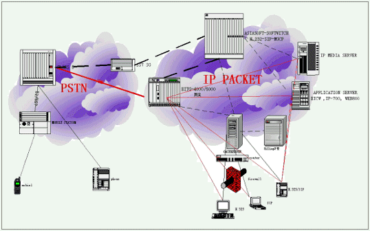 1、可以把裝有eProxy的服務(wù)器看成專用交換機VoIP switch,它負責內(nèi)外電話的接通與斷開。如圖: