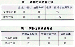 一般來說,最能影響呼叫中心運(yùn)行能力的功能特征有3個(gè)方面:分組排隊(duì)功能、統(tǒng)計(jì)分析功能以及電話、數(shù)據(jù)與應(yīng)用的同步功能。上述兩種方案比較列于表1和表2。