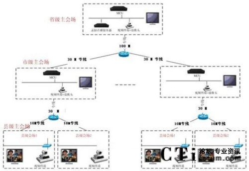 本方案整體采用基于IP網(wǎng)絡(luò),在省、市中心機房放置MCU,通過網(wǎng)線接入核心交換網(wǎng)絡(luò);在會議室放置視頻終端,通過郵政專網(wǎng)進行互聯(lián)。一級系統(tǒng)以省中心會議室為主會場,下屬各市會議室為分會場組成邏輯星形拓?fù)浣Y(jié)構(gòu);二級系統(tǒng)以市州郵政局會議室為主會場,下屬各區(qū)縣郵政局會議室為分會場。兩級系統(tǒng)通過MCU級聯(lián)互通,形成一個樹形的拓?fù)浣Y(jié)構(gòu)。系統(tǒng)主要由全視頻會議管理系統(tǒng)、純硬件MCU、純硬件1080P高清會議終端等組成,采用MCU為中心的星形結(jié)構(gòu)建立一個數(shù)字連接的、專業(yè)的視頻會議系統(tǒng)。視頻會議系統(tǒng)可由省郵政廳視頻會議中心控制,任意切換參會市、州(分中心)、縣、市、區(qū)(終端)的會議畫面。視頻會議系統(tǒng)可以指定任意參會單位發(fā)言并實現(xiàn)全省會場統(tǒng)一的畫面切換。視頻會議系統(tǒng)可實現(xiàn)省郵政局集中控制與管理,易于使用,能進行遠程管理、遠程維護、可降低維護成本。通過授權(quán),各級單位可自行組織、控制會議,方便各級單位的使用。