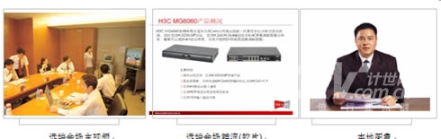 對于很多分會場通常只有1臺顯示設備的情況,H3C公司的視訊終端提供在1臺顯示設備上同時顯示"遠端的會場圖像+遠端膠片+本地會場圖像",顯示模式可通過終端遙控器靈活選擇:遠端圖像、遠端膠片、遠端圖像+遠端膠片、,實際顯示效果如下圖所示: